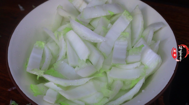 6、这时候白菜帮也撒好水了,加入清水清洗一下,捞出后沥干水分就可以开始炒制了。