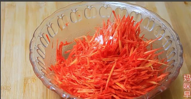 1、胡萝卜洗净后去皮,然后插成细丝,加入盐腌制20分钟。目的是为了沙出胡萝卜里的水分,让它变得更柔软一些。