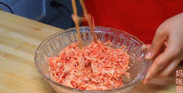 2、腌制时间到了后,在胡萝卜里面加入剁碎的肉馅,再加入适量玉米淀粉和面粉。目的是是为了让胡萝卜能粘在一起。