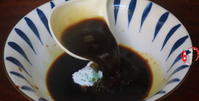 6,时间到了后淋入水淀粉,搅拌至汤汁浓稠,最后来点儿香油,再来一勺香醋,撒上香菜就可以享用了。
