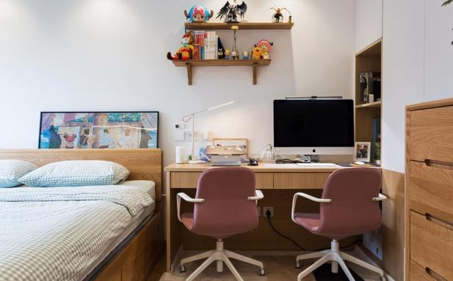 抛弃一个床头柜,选择一个双人书桌,完美解决了主人和妻子一起办公的需求。