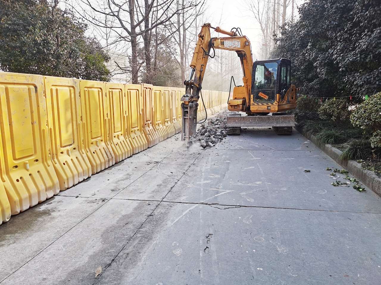 1月31日,记者来到徐塘社区供水管网改造工程施工现场,在施工的围挡内看到,挖掘机正在进行道路切割破碎。