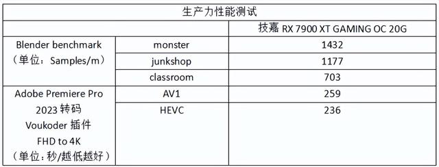 由于技嘉RX 7900 XT GAMING OC 20G拥有20GB的大容量显存、提供双媒体引擎并具备极强的算力,因此在内容创意设计方面也能发挥出强大的实力。我们使用Blender benchmark来考查显卡在3D渲染输出方面的加速能力,其表现相当不错,较上代产品有了大幅的提升。