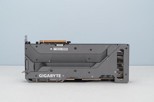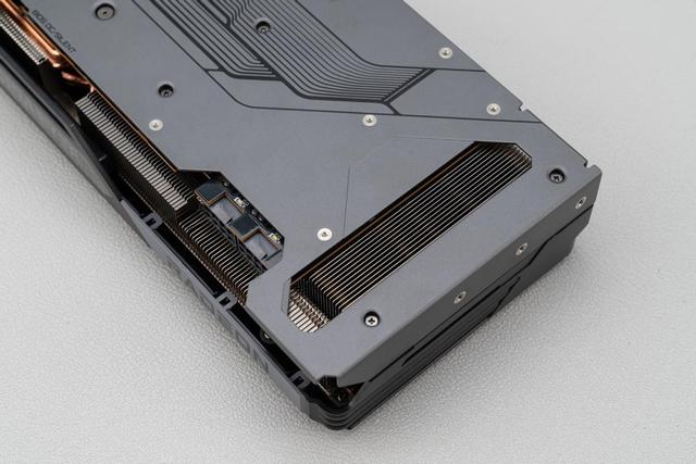 作为GAMING OC系列的一员,技嘉RX 7900 XT GAMING OC 20G采用了标志性的风之力散热系统。散热器内部由均热板直触GPU和显存,可以将这些元件发出的热量通过9根复合式热管高效地传导出来,确保GPU和显存核心能在较高的频率下持续稳定运行。同时显卡还采用了比PCB尺寸更长的散热鳍片,并在背板上开设了进气孔,在增加散热面积的同时,还能让更多的风流通过鳍片,增强散热性能。