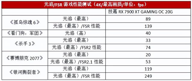针对光追游戏,RDNA 3配备了第二代光线加速器,相对上代进一步提升了效率。所以从测试结果可以看到,技嘉RX 7900 XT GAMING OC 20G在4K分辨率和最高光追效果下的性能表现远好于上代产品。如果再加上A卡的黑科技FSR,画面平均帧速更是能获得超过一倍的提升。特别是《赛博朋克2077》中,开启FSR2.1之后,画面平均帧速就从20fps一下子就提升到了53fps,效果立竿见影。