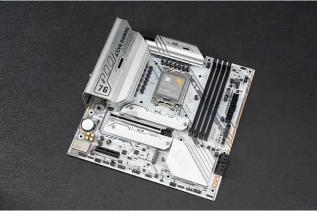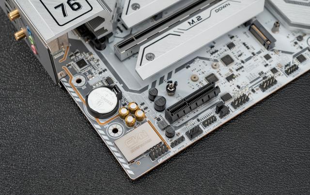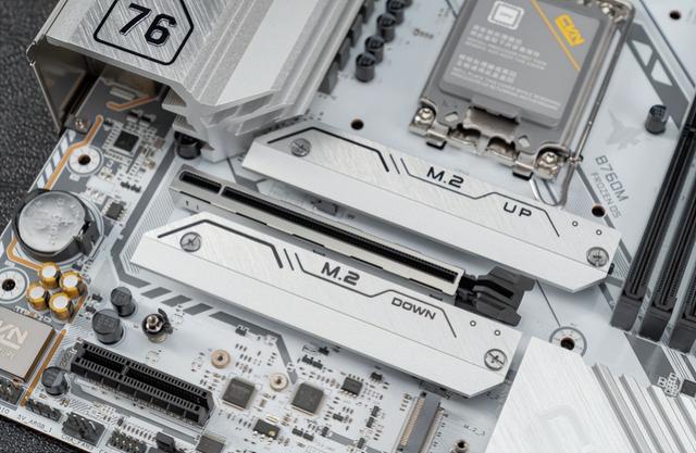 具体来说,白色雾化涂装的PCB板和银色金属散热片共同打造出充满了金属质感的银白外观。散热片表面加入了炫彩护甲丝印的工艺,绘有设计灵感来源于战舰弦号的“76”(代表B760芯片组)字符以及类似于太空战舰舱盖的图案,呈现出更极致的高级感和科幻感,为“海景房”机箱或侧透机箱玩带来全新的视觉体验。