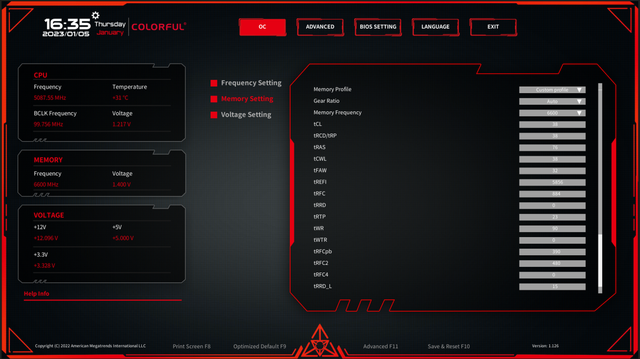 主板具备内存超频的功能,在OC界面中可以对内存的各项参数进行细致的调节。而且BIOS界面简洁、功能完善上手简单,用起来得心应手。我们使用的这款DDR5内存打开XMP后默认频率为6000MHz,时序为40-40-40-76,我们直接对其进行手动超频。在七彩虹CVN B760M战列舰的BIOS中将内存频率设置为6600MHz,接着缩紧内存的时序,设置为38-38-38-76,最后将Memory Controller Voltage(内存控制器电压)从1.35V提升到1.4V。保存设置后电脑成功开机,此时的内存超频到了6600MHz@38-38-38-76。相信如果搭配超频能力更强的内存,七彩虹CVN B760M战列舰的表现还能带给我们惊喜。