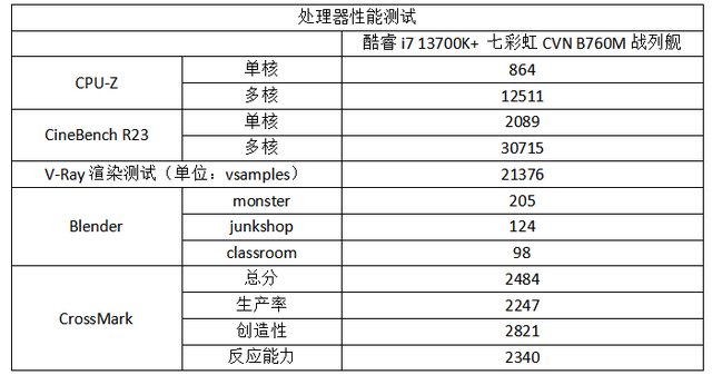 在七彩虹CVN B760M战列舰上安装酷睿i7 13700K。在CPU-Z中,酷睿i7 13700K凭借比较高的睿频频率,获得了864分的单核成绩。由于其总共24个线程的配置,处理器也轻松获得了12000+分以上的多核得分。在Cinebench R23中,处理器的性能发挥同样可圈可点。