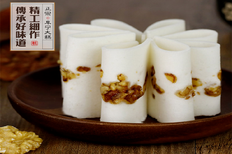 阜宁大糕由优质糯米、纯净白糖、精致油脂及高级蜜饯等按比例精心制作而成,糕片轻薄如白纸,柔软似丝绸,具有可燃可卷的特点;表面光滑无糖斑,呈乳白色;入口绵软滑润,甘甜如蜂蜜,有淡淡米香。