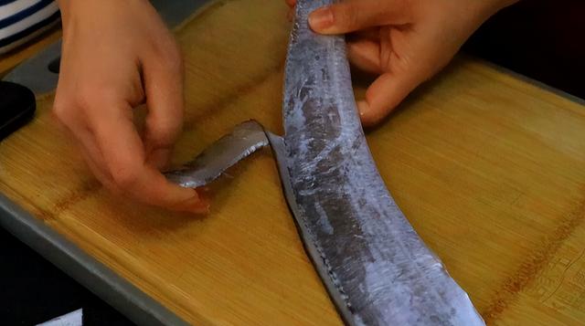 1、首先带鱼处理干净,肚子里的黑膜一定要洗干净,这是导致鱼肉腥味重的关键,然后切掉头尾,然后把鱼鳍撕下来。
