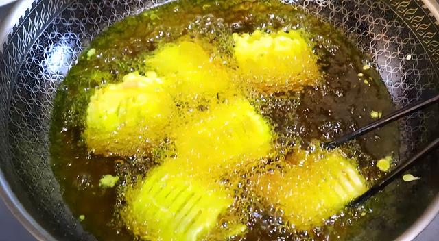 6、锅里烧油,油温6成热时下入鱼块,,中火慢炸,先不要着急翻面,等底部定型后再翻,不断的翻面让带鱼受热均匀,差不多炸个5分钟左右,带鱼表面变得金黄酥脆就可以了。