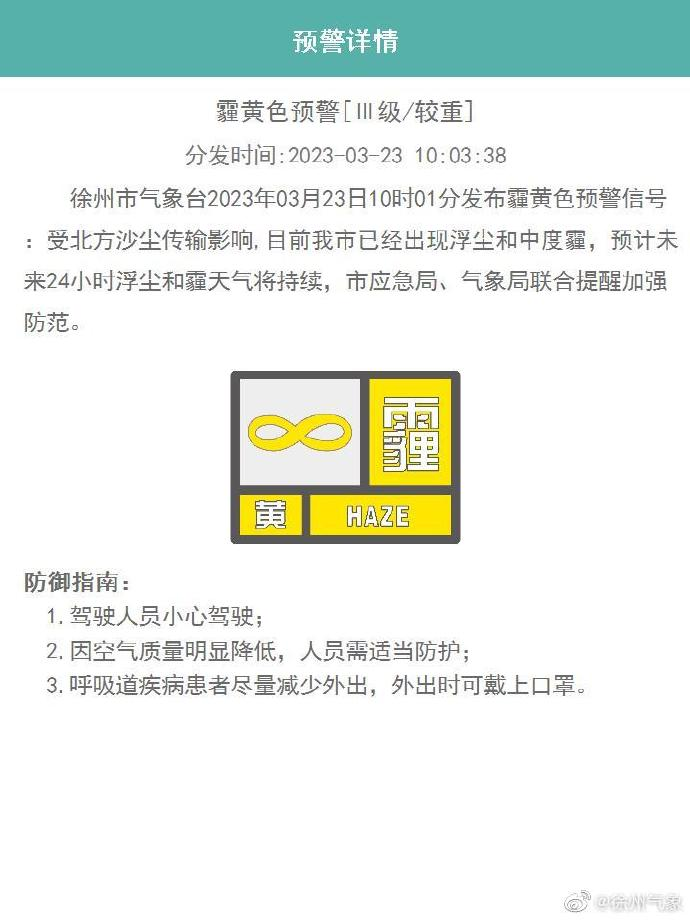 邳州市气象台2023年03月23日10时13分发布霾黄色预警信号:受北方沙尘传输影响,目前我市已经出现浮尘和中度霾,预计未来24小时浮尘和霾天气将持续,请注意防范。