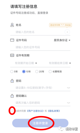 3.输入相关注册信息,勾选“阅读并同意”,点击注册并登录,完成人脸认证,领取医保电子凭证。