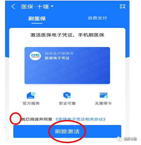 2.勾选“我已阅读并同意《医保电子凭证相关协议》”后,点击刷脸激活。
