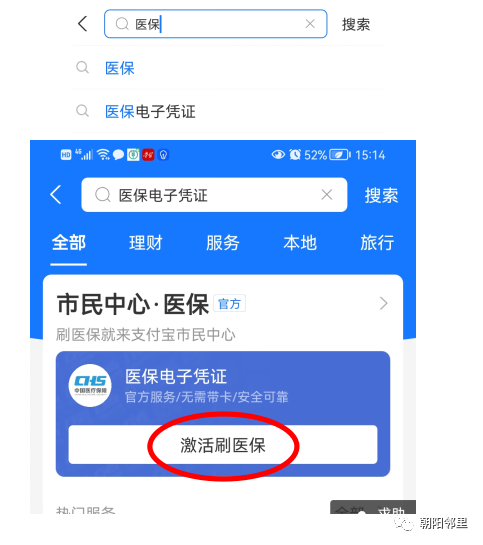 1.打开支付宝,搜索医保电子凭证,点击激活刷医保。