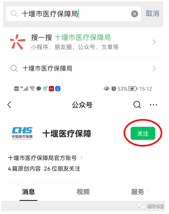 1.在微信中搜索十堰市医疗保障局,关注十堰市医疗保障局公众号。