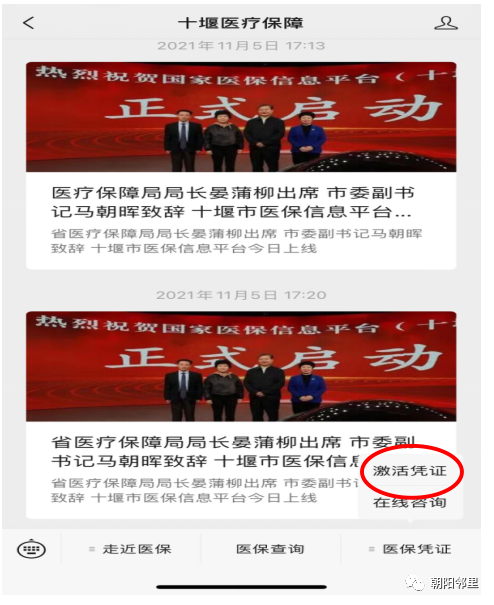 2.打开公众号的对话窗口,点击右下方的医保凭证,选择激活凭证。