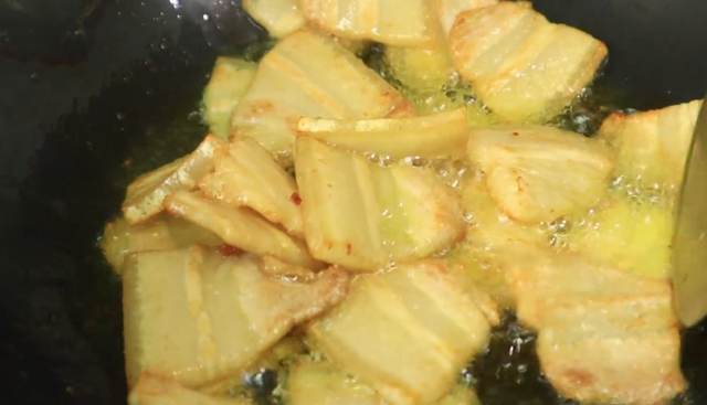 3、把锅烧热倒入菜籽油,然后放入五花肉煸炒。先把五花肉的油脂煸炒出来。这样吃起来才不会腻。