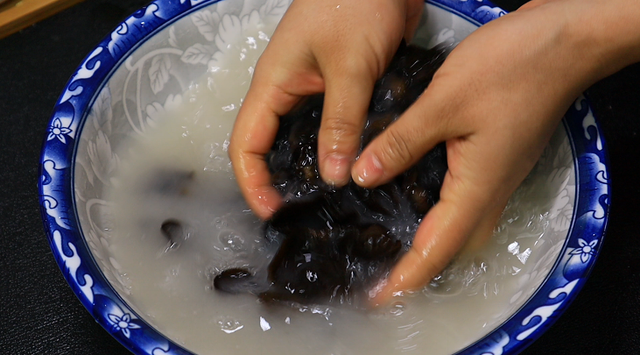 3、泡好的木耳再用清水冲洗几遍,这个泡出的木耳非常的干净。