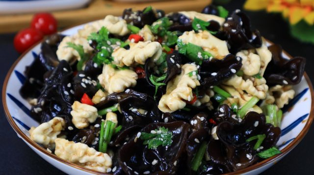 主要食材:桃仁、木耳、蒜末、小米椒、香菜