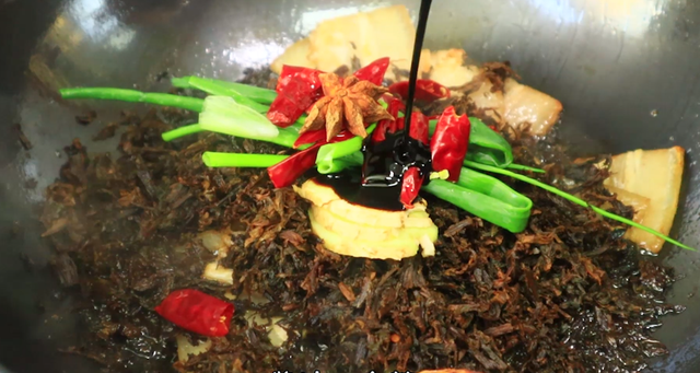 4、接着放梅干菜,葱姜、干红椒、八角,酱油、白糖,梅干菜比较吸油,所以煸出的油脂不用盛出来。