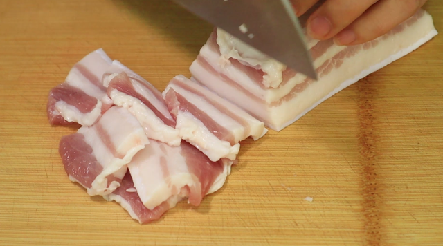 1、准备3层五花肉清洗干净之后,切成0.5厘米左右的薄片,不能太厚不容易熟,也不能太薄,吃起来口感不好。
