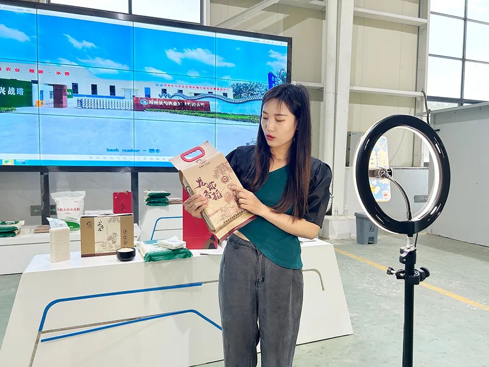 在位于车辐山镇的邳州长勺农业发展有限公司直播间,主播正通过网络直播的方式,销售公司稻米、小麦、面粉等农产品。