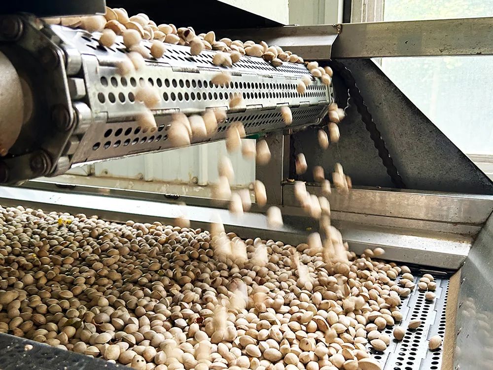 银杏清洗后,有个预煮过程,可筛选出不合格的空果。接下来依次进行蒸煮、速冻、真空低温油炸,按客户要求进行包装。