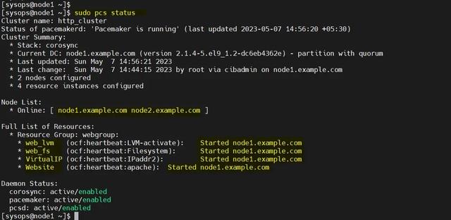 $ sudo pcs cluster setup http_cluster --start node1.example.com node2.example.com$ sudo pcs cluster enable --all