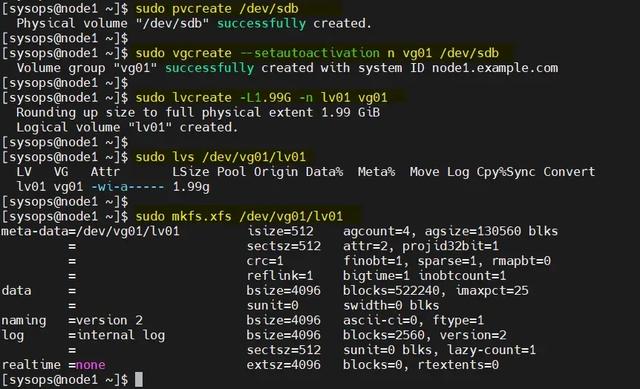 在 node1上依次执行以下一组命令创建 LVM 卷:
