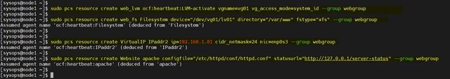 $ sudo pcs resource create web_lvm ocf:heartbeat:LVM-activate vgname=vg01 vg_access_mode=system_id --group webgroup$ sudo pcs resource create web_fs Filesystem device="/dev/vg01/lv01" directory="/var/www" fstype="xfs" --group webgroup$ sudo pcs resource create VirtualIP IPaddr2 ip=192.168.1.81 cidr_netmask=24 nic=enp0s3 --group webgroup$ sudo pcs resource create Website apache configfile="/etc/httpd/conf/httpd.conf" statusurl="http://127.0.0.1/server-status" --group webgroup