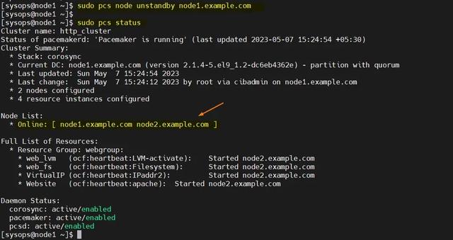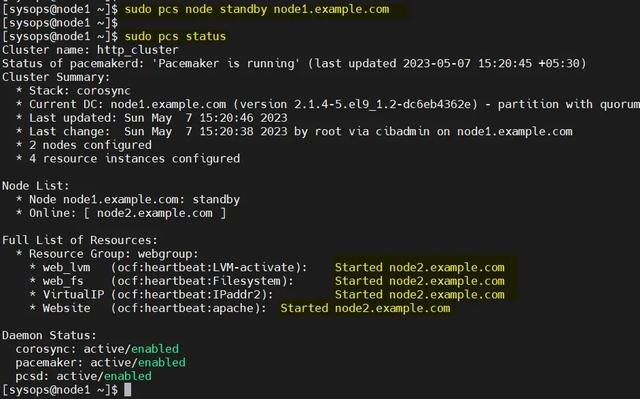 $ sudo pcs node standby node1.example.com$ sudo pcs status