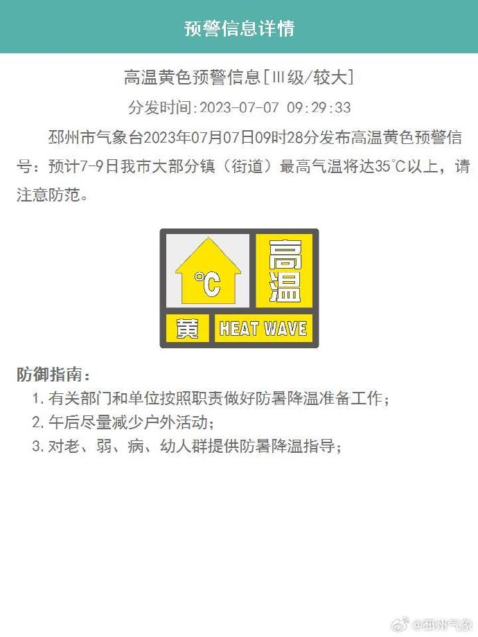 邳州市气象台2023年07月07日09时28分发布高温黄色预警信号:预计7-9日我市大部分镇(街道)最高气温将达35℃以上,请注意防范。