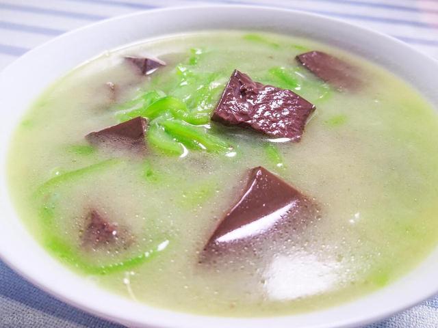 3、锅中烧水,水开后先下鸭血煮5分钟,然后放入丝瓜煮3分钟。