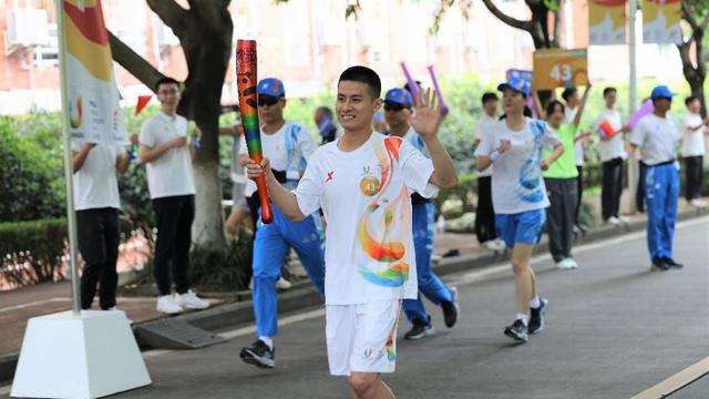 7月26日,成都大运会火炬传递迎来最后一个传递日活动,京东快递小哥黄学根作为第43棒火炬手,在成都理工大学站从前一棒手中接过“蓉火”,顺利完成了“青春之火”的传递。