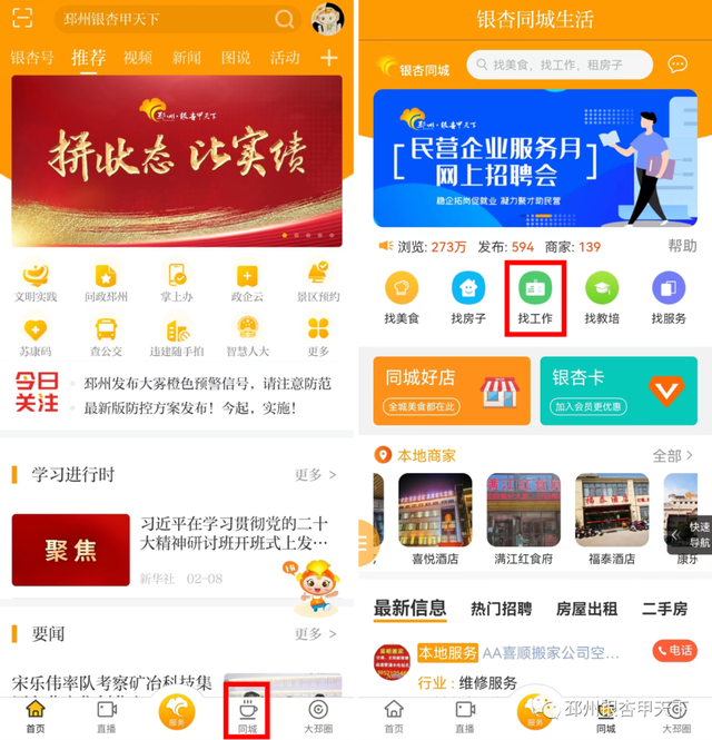 点击首页底部菜单栏“同城”进入“银杏同城生活”点击“找工作”即可进入“同城招聘”平台