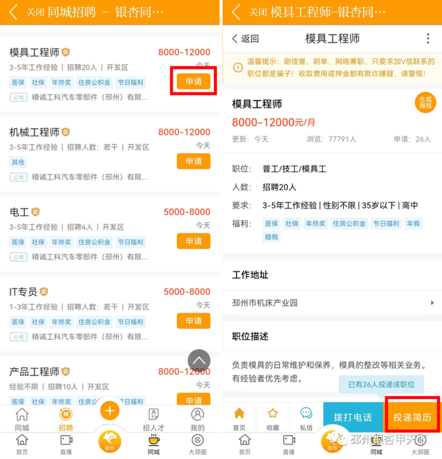只需点击“申请”“投递简历”
