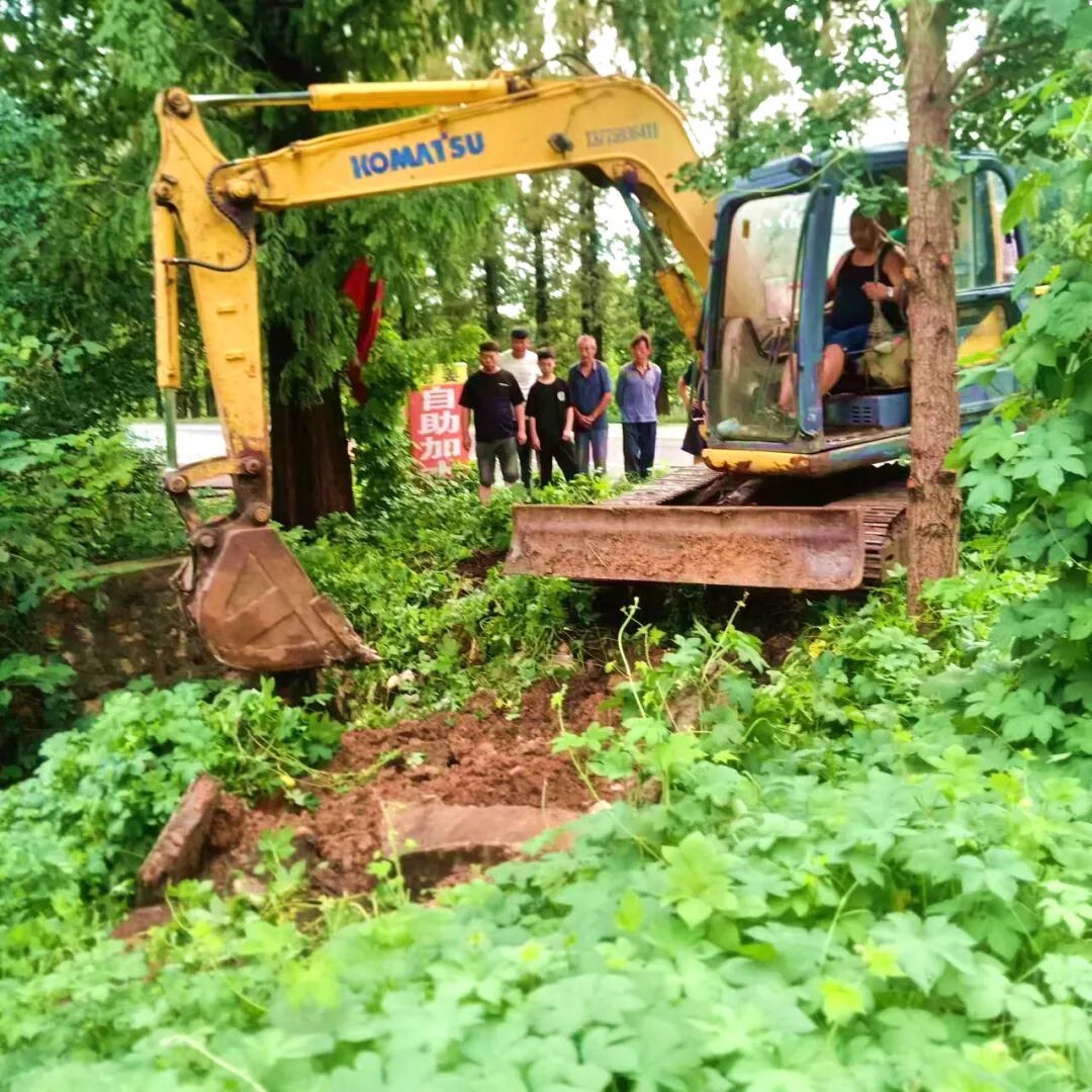 炮车街道针对辖区积水情况,及时调用挖机协助排涝,并组织人员在村内挖建沟渠进行疏通排水。