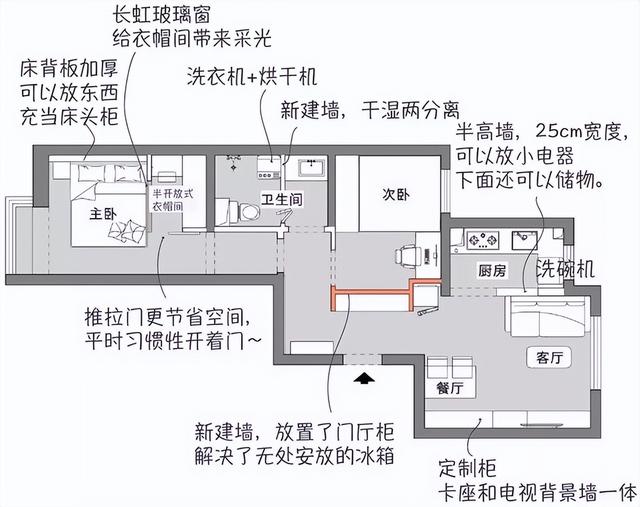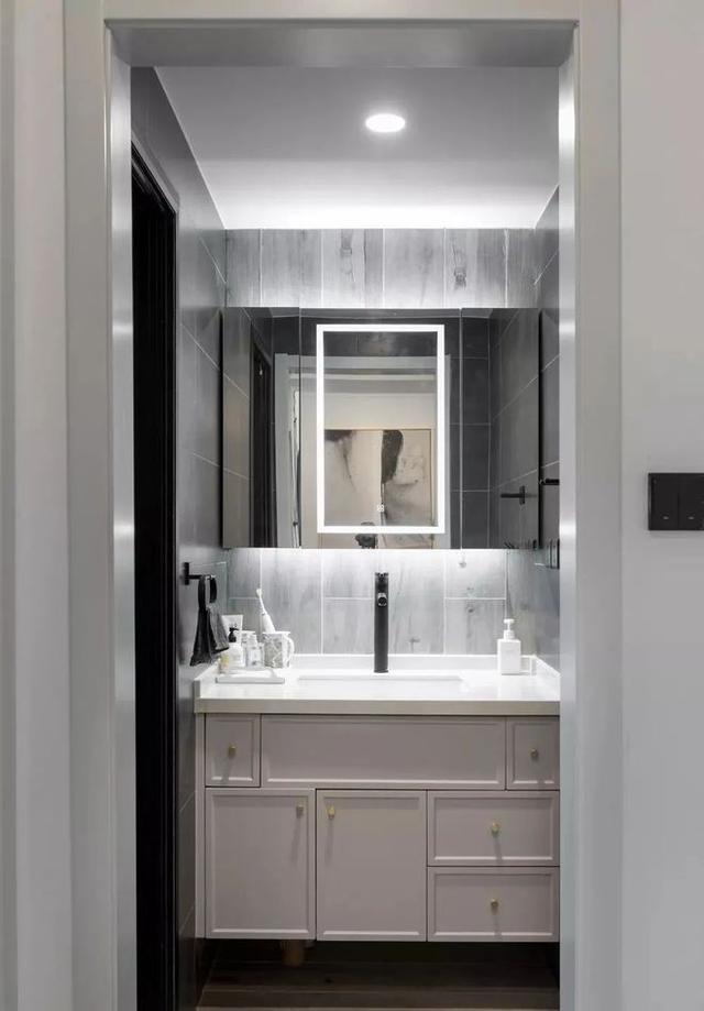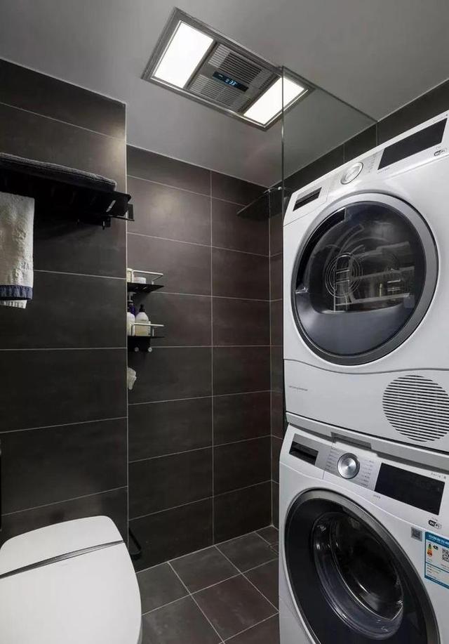▲卫生间将干区洗手台外移,做了彻底的干湿分离设计,解决了早晨抢厕所的问题。洗衣机和干衣机叠放进湿区,满足了基本的洗衣和晾晒功能,解放了阳台空间。