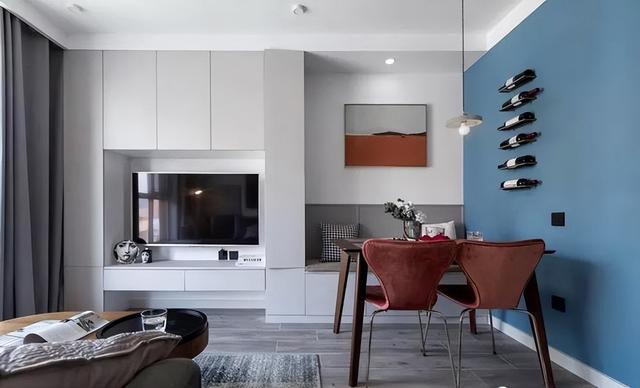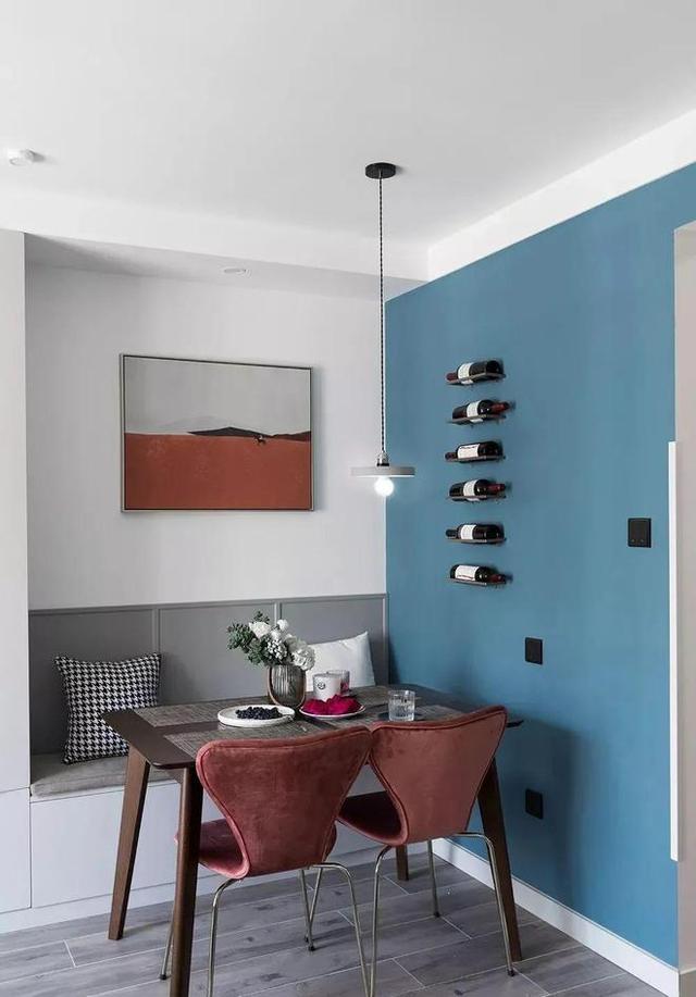 朱砂红的餐椅搭配湖畔蓝的墙面,加上有格调的红酒架,温馨而又有仪式感。