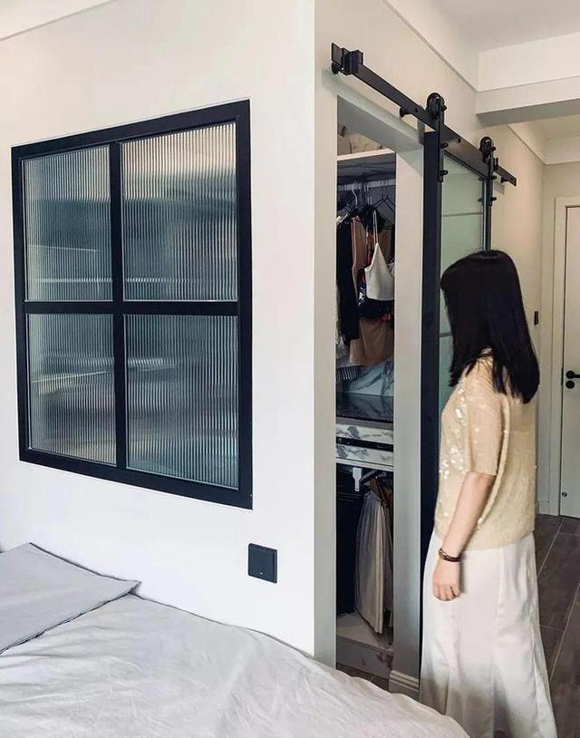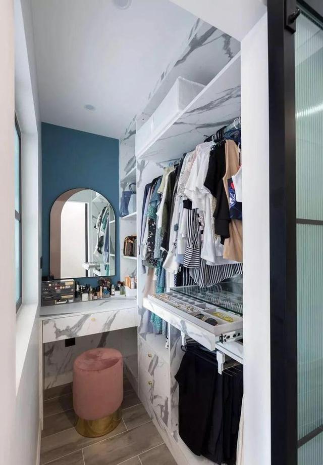 ▲主卧的空间里,还挤出了一个独立衣帽间,定制了开放式衣柜和梳妆台的组合,满足了女主人的小愿望。窗户和门都采用了长虹玻璃,既增加了采光,还有很高的颜值。