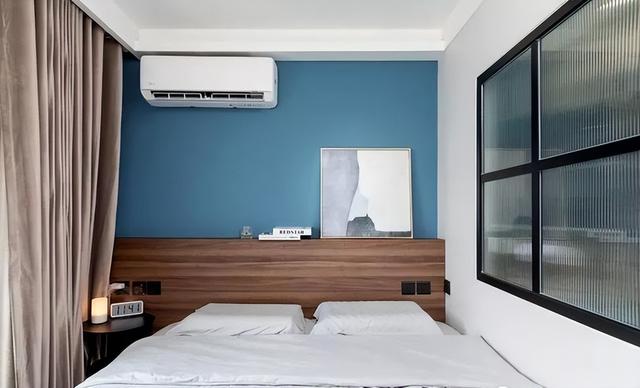 主卧的床头背景墙涂刷了湖畔蓝的墙漆,与餐厅墙面呼应,搭配木质床头靠背,加上无主灯设计,营造了简单纯粹的睡眠环境。