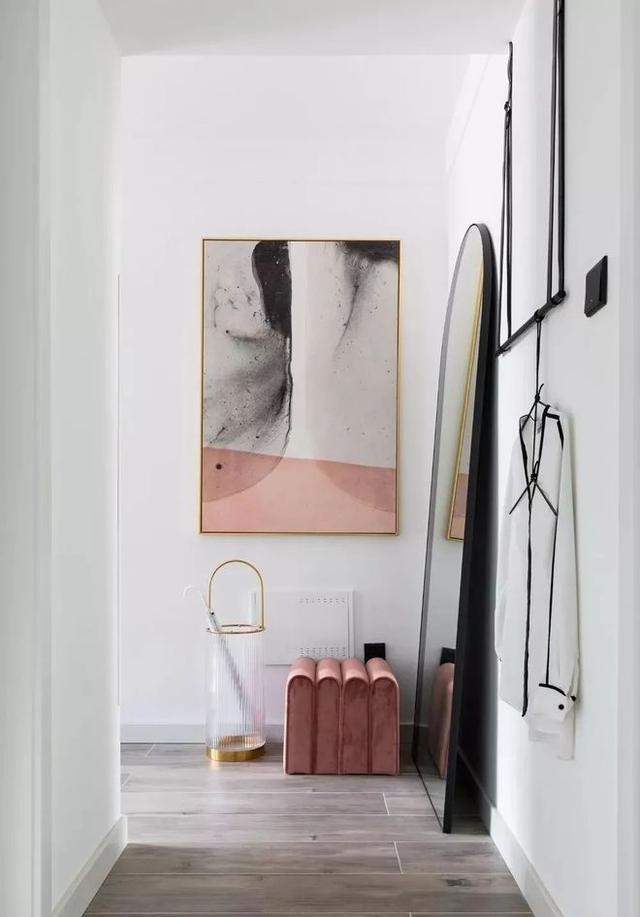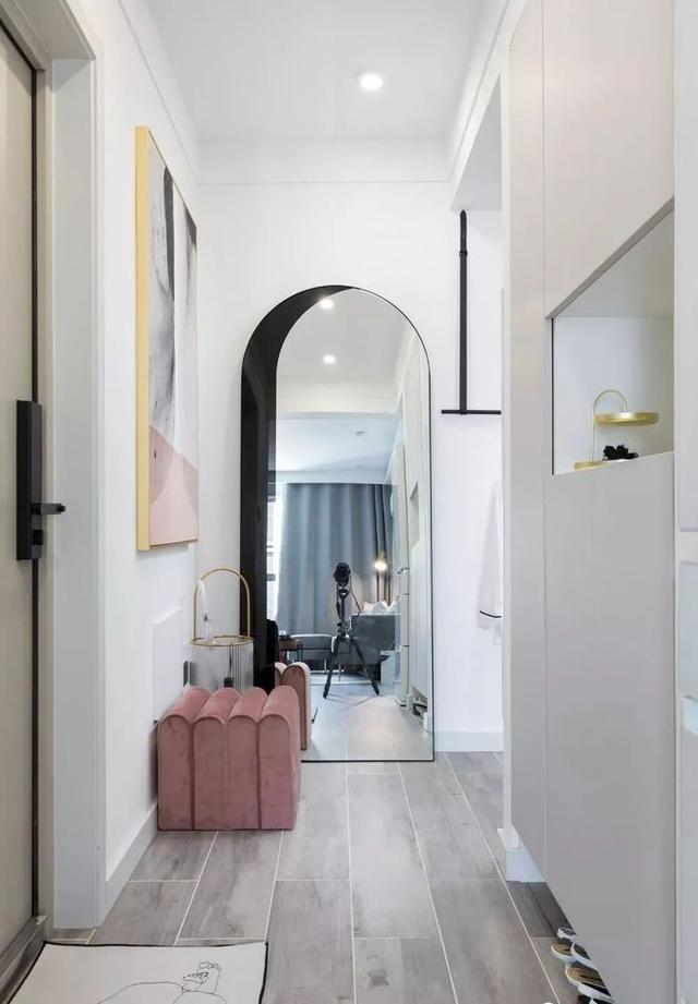 左手边设置了落地镜和粉色的换鞋凳,补充了玄关的功能,增加了进门的仪式感。