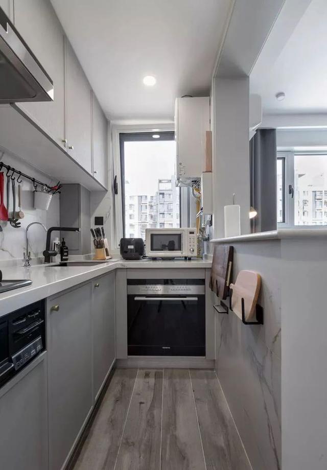 定制了L型的橱柜布局,提供了充足的收纳和操作空间,还嵌入了烤箱和洗碗机,充分利用了空间。