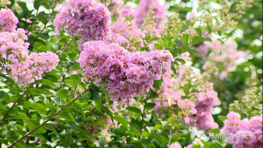 紫薇被夹种栽植在紫叶李树与冬青之间