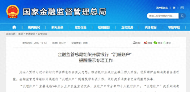 “沉睡账户”主要是指5年及以上未发生主动交易,且账户中有余额的个人银行账户。据国家金融监督管理总局10月13日消息,金融监管总局组织开展银行“沉睡账户”提醒提示专项工作,自2023年10月起持续1年,由各银行机构对“沉睡账户”持有人进行提醒和通知,帮助消费者了解自身银行账户开立情况,及时查看、使用或注销冗余账户。