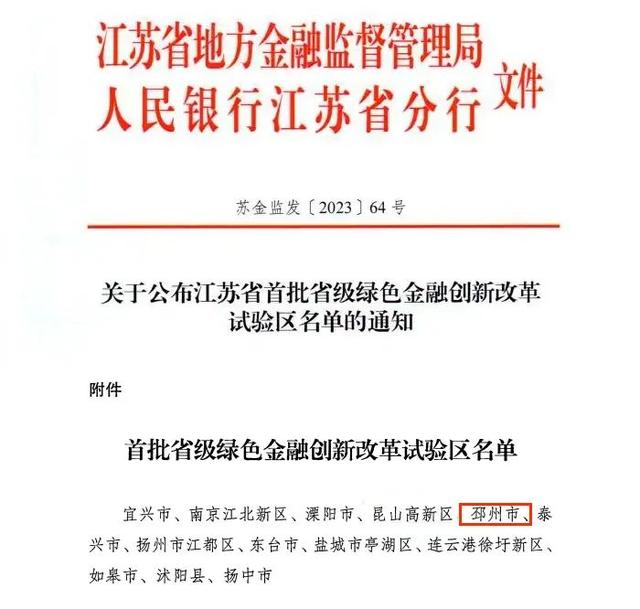 近日,江苏省地方金融监督管理局、人民银行江苏省分行联合公布了首批省级绿色金融创新改革试验区名单。邳州市成功入选,是徐州市唯一入选地区。
