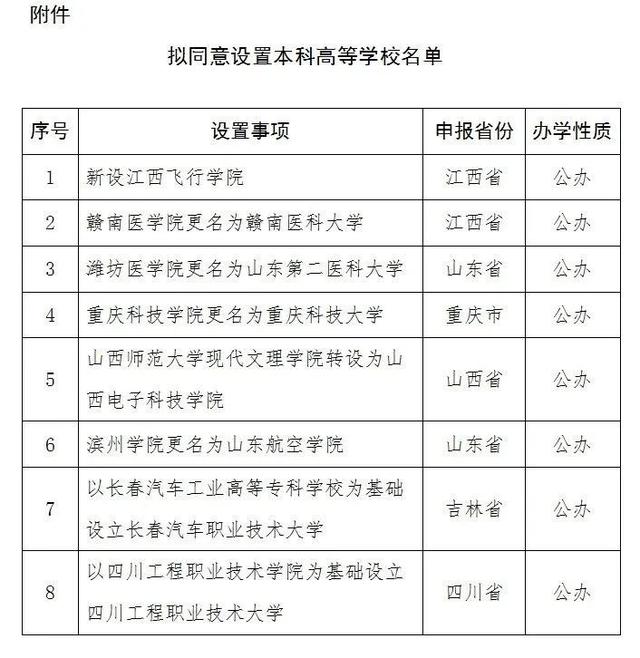 11月6日,教育部发布《关于拟同意设置本科高等学校的公示》,拟同意设置江西飞行学院等8所学校,公示时间为2023年11月6日至11月10日。
