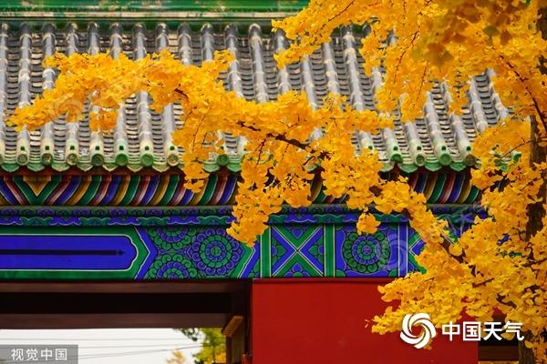 2022年10月29日,北京地坛公园金黄银杏与古建筑交相辉映。(签约供稿人/视觉中国/版权图片)