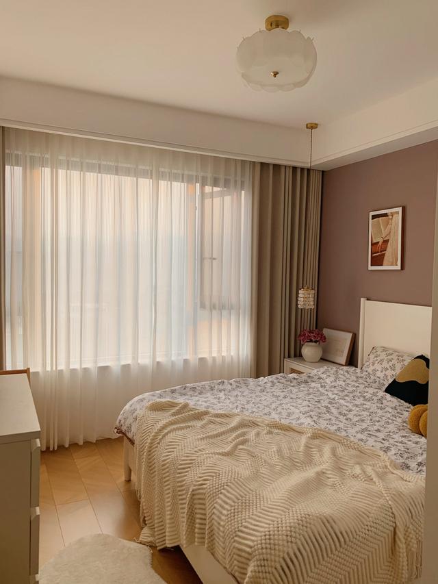 主卧是一个很温柔的空间。背景墙用灰粉色乳胶漆粉刷而成,有一种优雅高级的视觉感。天花板仍然采用极简主义的双眼皮,窗帘盒的空间也被保留下来。一盏羽毛枝形吊灯挂在天花板的中间,看起来很漂亮。